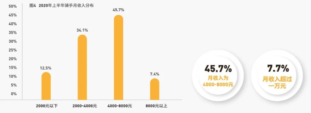 作為對比,美團發佈的《2020年上半年騎手就業報告》顯示,儘管有疫情影響,但仍有45.7%的騎手,月收入可達到4000-8000 元,甚至7.7%的騎手,月收入還超過了一萬元。