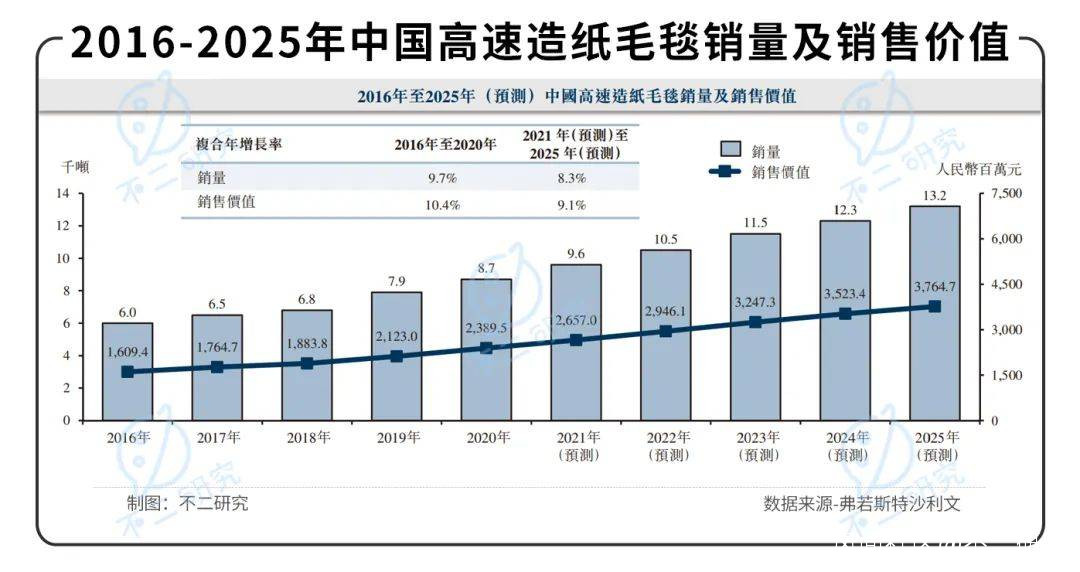 高速造紙毛毯的銷量由2016年約6000噸增長至2020年約8700噸,複合年增長率為9.7%。中國高速造紙毛毯的銷量預期將於2021年至2025年按複合年增長率8.3%增長。