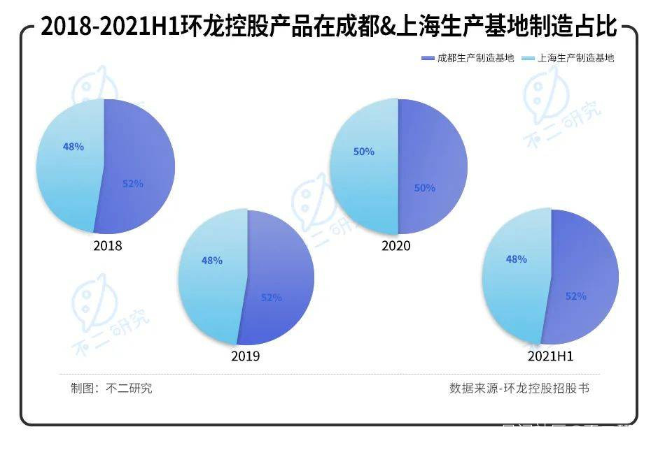 環龍控股分為成都和上海兩個生產基地。招股書中顯示,2018-2020年,以及2021上半年,分別有約52%、52%、50%和52%的產品在成都生產基地製造,而分別有約48%、48%、50%和48%的產品則在上海生產基地製造。