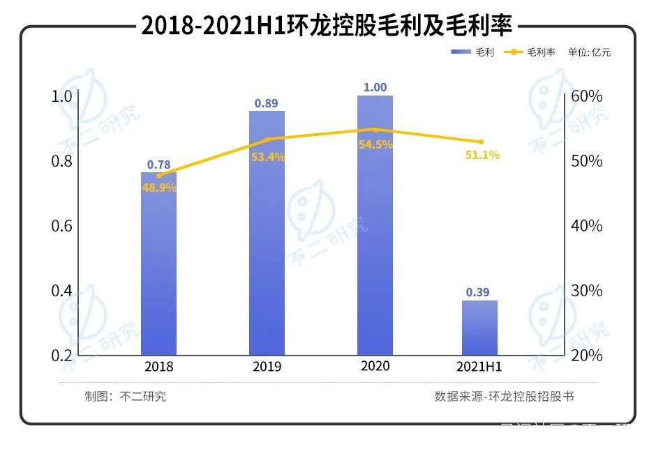 從毛利方面來看,2018-2020年,以及2021上半年,環龍控股的毛利分別為0.78億元、0.89億元、1.00億元和0.39億元;毛利率分別為48.9%、53.4%、54.5%和51.1%。