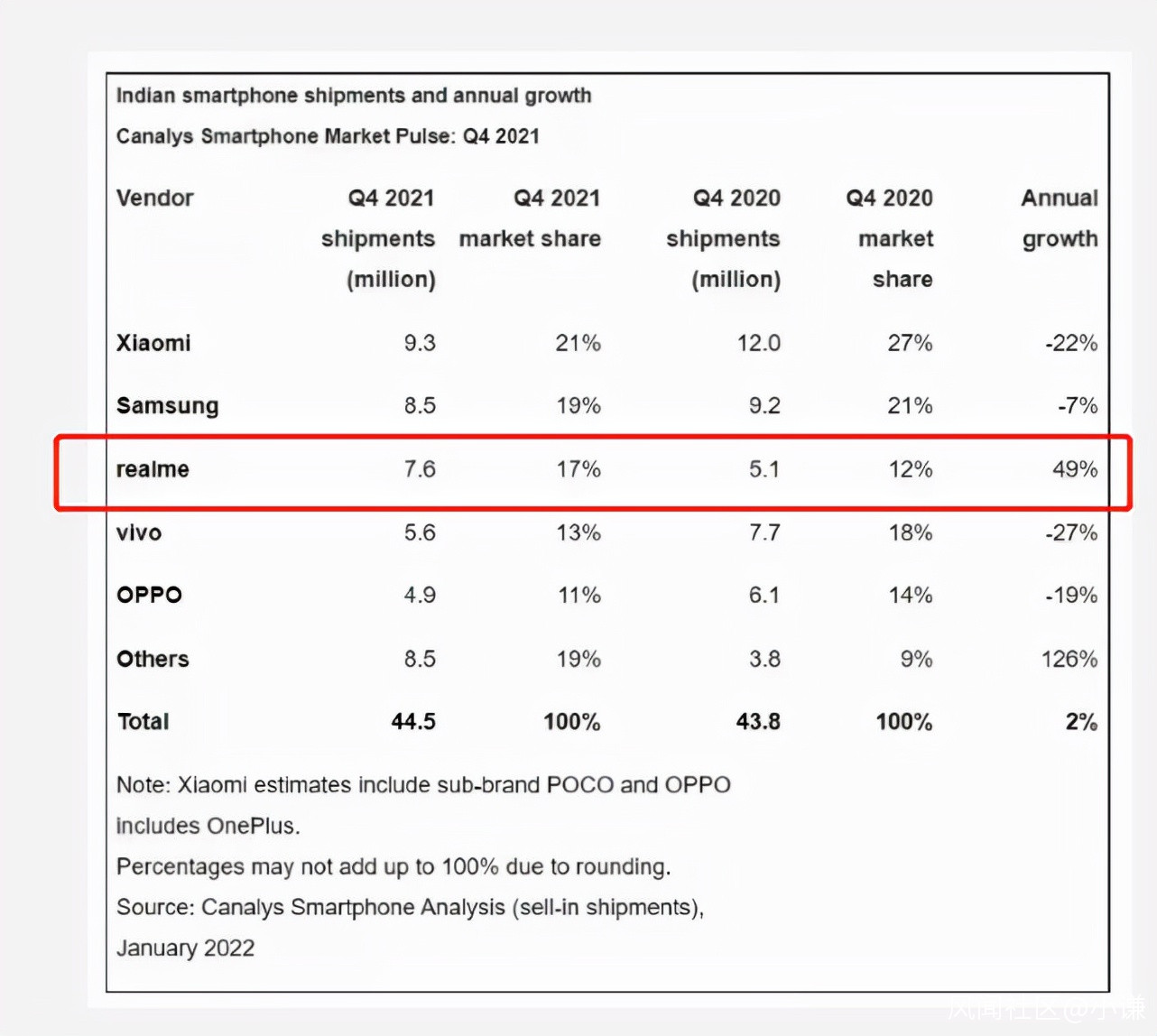 就影響力而言,realme顯然是比不上小米等率先進入市場的品牌,但realme的優勢在於專注中低端,且兼顧時尚感,更有針對性,能在細分領域挖掘出更多潛在需求,這也是realme能在短短三年時間內將印度市場的市佔率提升至17%的重要原因。