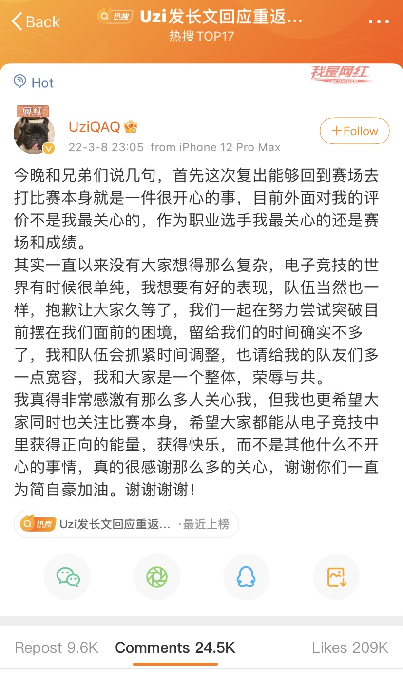 昨晚“Uzi髮長文回應重返賽場”話題衝上了微博熱搜。