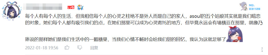 例如國內人氣高漲的虛擬女團A-SOUL,在B站、貼吧、微博等平台,常有粉絲真情實感講述自己“被圈粉”的心路歷程。其中,“快樂”、“包容”都是常見的字眼,有人表示“被五個人的努力和真誠打動”,有人告誡自己“拋下成見”,還有感謝偶像給予自己“做出改變”的動力。