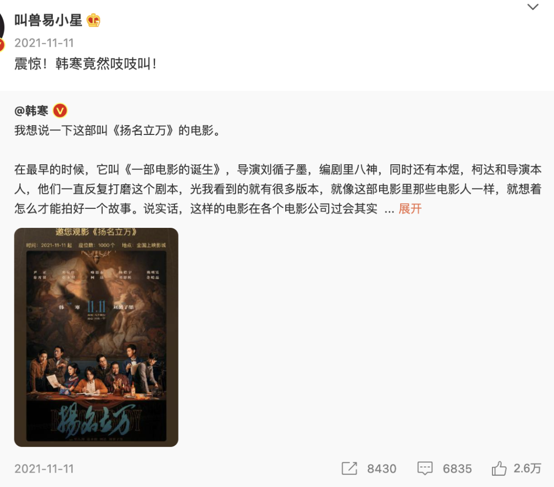 △易小星離開了,但依然轉發《揚名立萬》電影宣傳