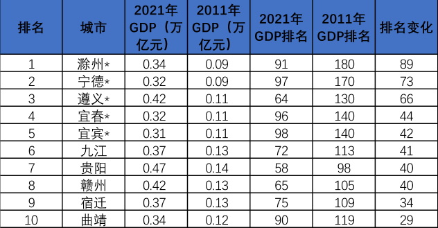 2011年和2021年這十年,GDP排名進步最快的10個城市分別是:
