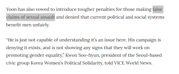 同時,尹表示要嚴懲那些“誣告性侵”的人,同時否認現在韓國的政策讓男性受益。