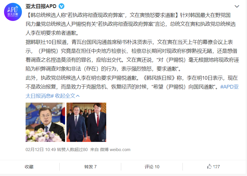 同時,尹錫悦表示如果當選,要徹查文在寅政府貪污舞弊案,大有不把文在寅送進去不罷休的架勢,乃至於文在寅憤怒地要求他道歉: