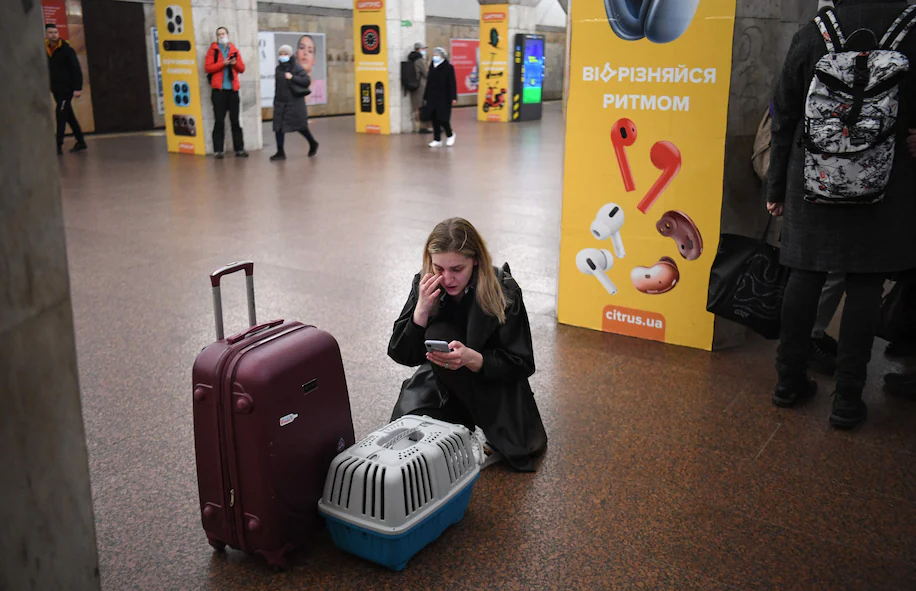 哈爾科夫不斷傳來爆炸聲,一隻小狗眼神惶恐,好在主人並沒有拋下它獨自去地鐵中避難,而是緊緊抱着它,在人流中不斷安撫着它別害怕。