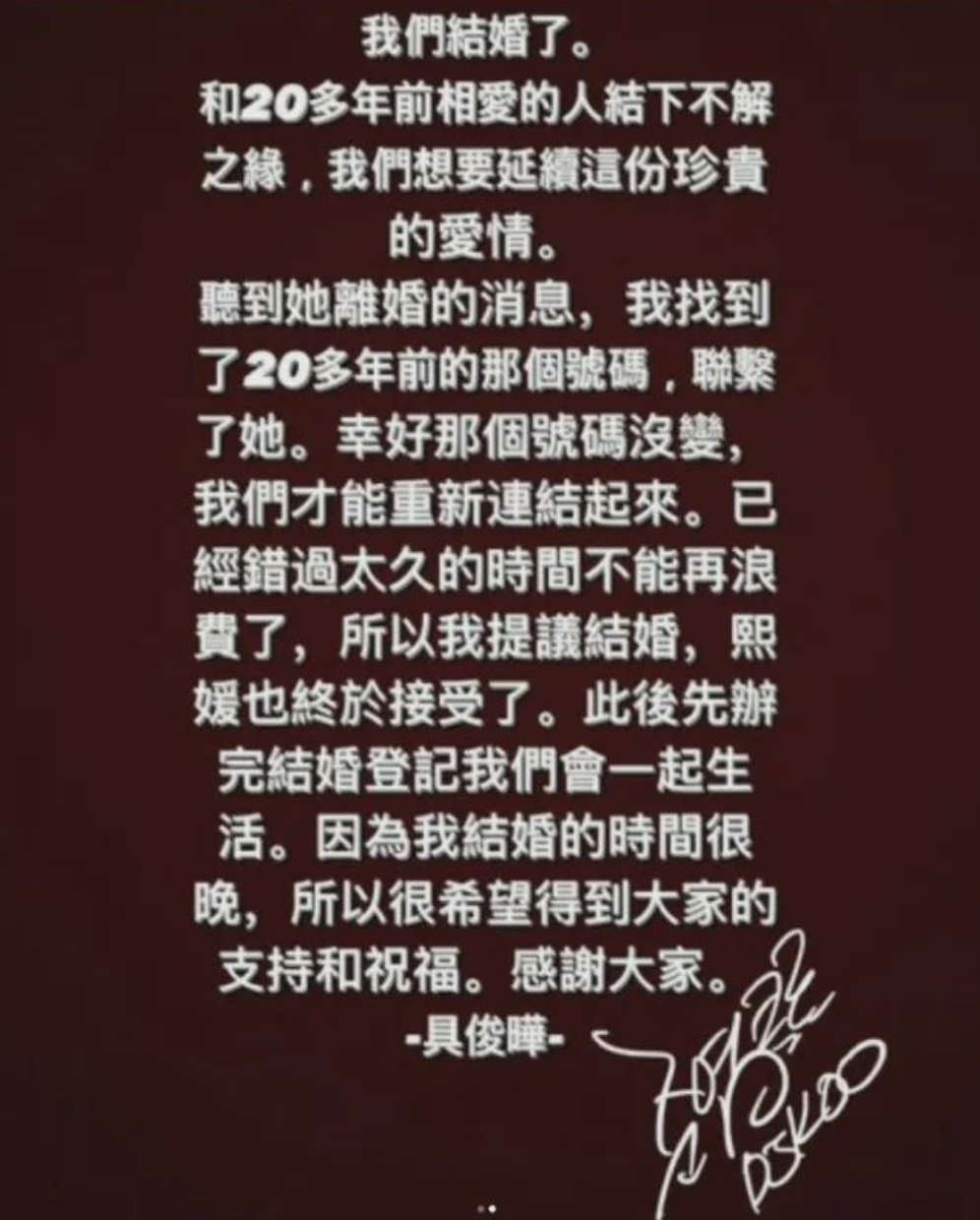 昨天婦女節,具俊曄公開宣佈:“我要結婚了,想和20年前相愛的女人延續愛情。”
