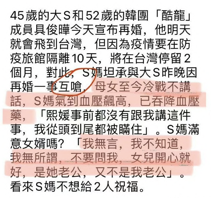 想多了朋友們,根據台媒的説法,大s這次閃婚並沒有氣到汪小菲,反而把她媽氣得高血壓了。