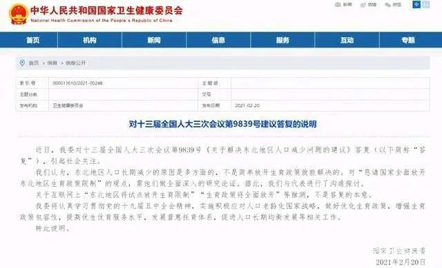 2021年2月,國家衞健委對十三屆全國人大三次會議第9839號《關於解決東北地區人口減少問題的建議》答覆(以下簡稱“答覆”),引起社會關注。