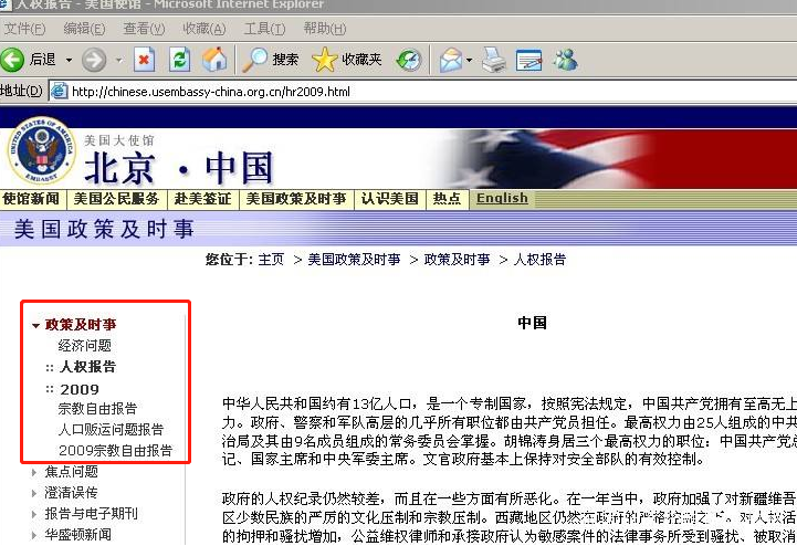 再比如,美國駐華使館網站每年都會在線提供美國務院發佈的《中國人權報告》《中國宗教自由報告》《中國人口販運報告》等內容,在社會制度、人權、民族、宗教等問題上與中國的立場對弈。