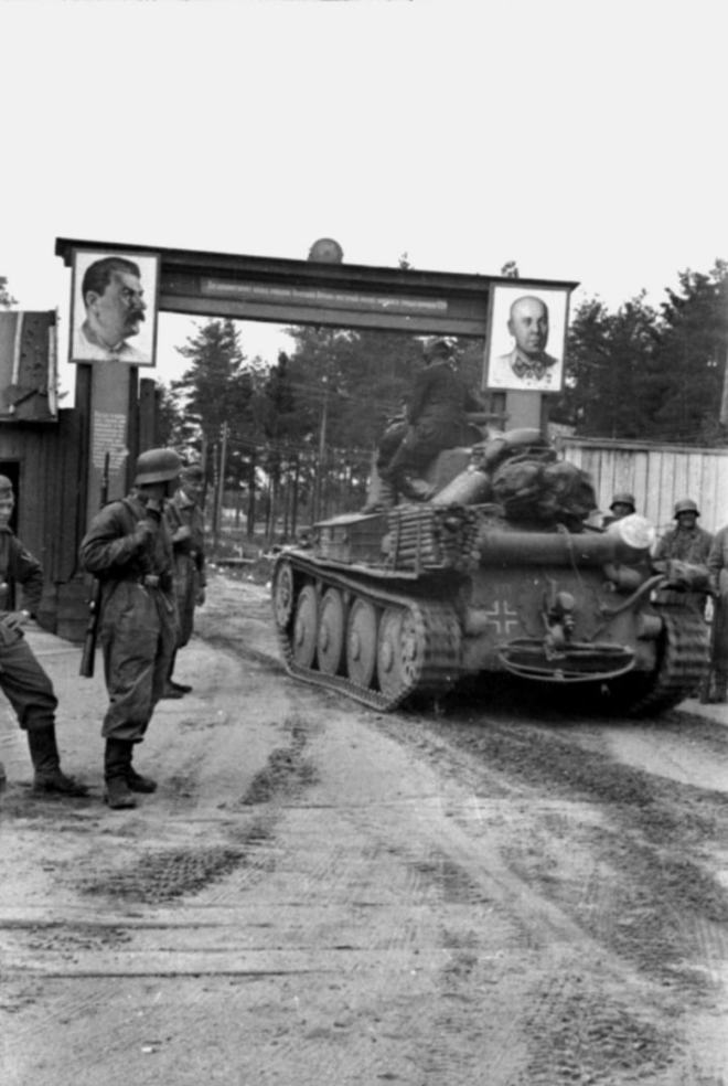 1941年德國納粹包圍基輔時,並列高掛的斯大林和烏克蘭統帥鐵木辛哥畫像。