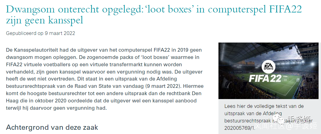 在兩年前,荷蘭海牙法院曾對知名足球遊戲《FIFA》做出高達1000萬歐元的罰款,理由是它的製作商EA違反了當地相關的賭博法律。