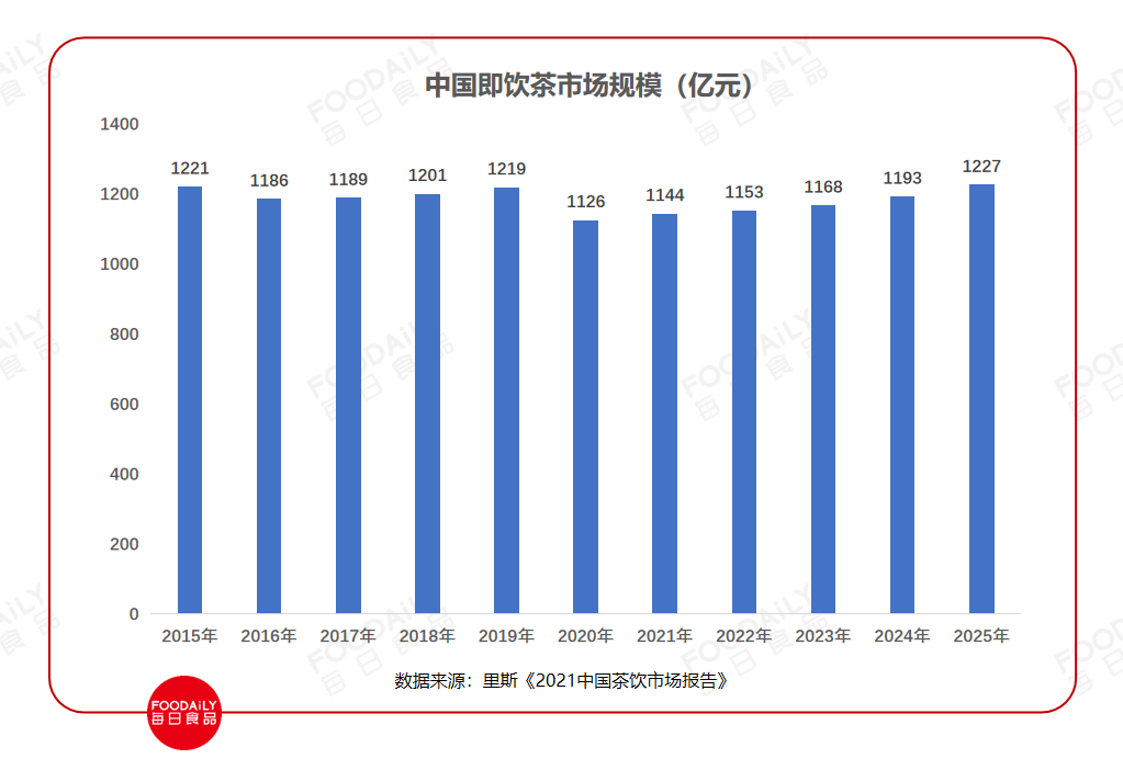 歐睿國際數據顯示,2020年中國即飲茶市場規模為1126億元,預計2025年市場規模約1200億元。在“慣性”消費的帶動下,整體呈現增長放緩的態勢,亟需找到新的增長極。