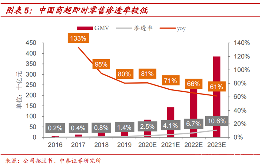 目前看,即時零售是個高天花板賽道。以商超到家為例,根據達達招股書中艾瑞諮詢提供的數據,2019年商超到家規模達到467億元,且滲透率僅為1.4%,預計2019-2023年複合增速將達到69.5%。