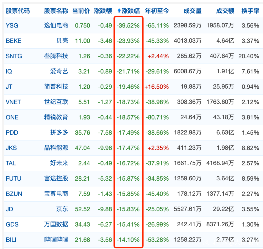 當日晚間,熱門中概股遭遇集體大跌,38只中概股大跌超10%。其中,逸仙電商大跌超39.5%,貝殼大跌23.9%,愛奇藝跌21.7%,拼多多跌17.5%,京東跌超15.8%,嗶哩嗶哩跌超15%。