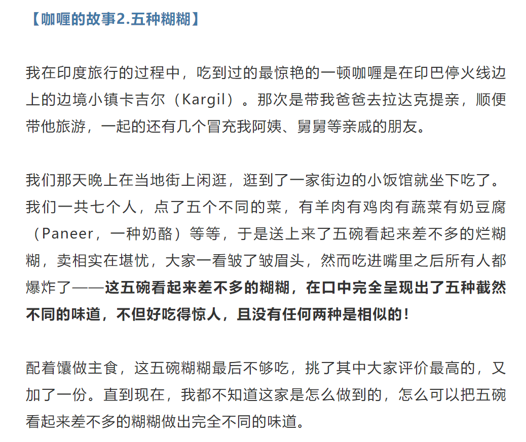 第二個例子: 我的朋友隨水在其關於印度咖喱的博文中也提到過一段有趣的經歷。(原文鏈接:被重新發明的印度文化(一)咖喱)