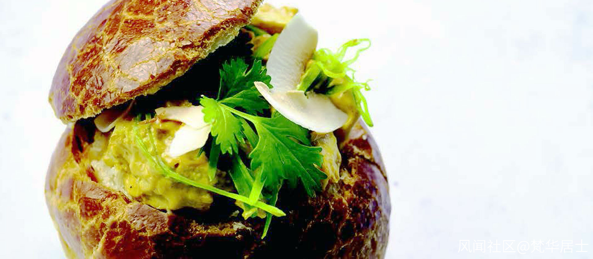 為1953年英國女王伊麗莎白二世加冕典禮創作的加冕咖喱雞(原名Poulet Reine Elizabeth,現在多成為Coronation Chicken),是由精心調製的咖喱雞肉置入掏空的布里歐修面包做成 | 圖源:倫敦藍帶廚藝學院