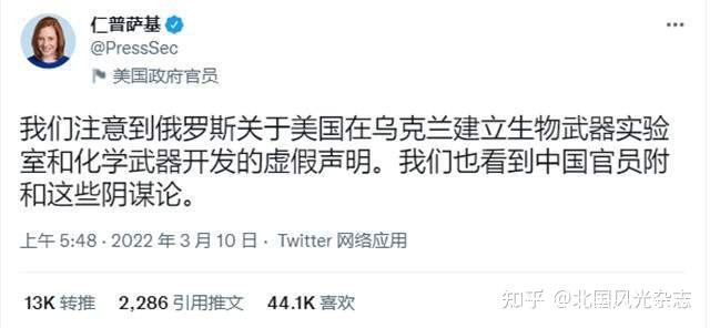 白宮新聞秘書普薩基推特譯文普薩基還倒打一耙,稱俄羅斯以及俄羅斯支持的敍利亞才有使用化學武器的記錄,既然俄羅斯如今對美國做出了“錯誤的斷言”,那麼美方有必要對俄羅斯在烏克蘭使用生化武器的可能性予以密切關注。急則生亂,亂則出錯。普薩基在發這8條推特前,或許沒有仔細查證核實,她的發言中有一個非常致命的事實錯誤:美國並沒有做到不在任何地方開發或持有生化武器,相反,美國是迄今唯一一個仍然擁有化學武器的國家。國際社會一再要求美國儘快完成庫存化學武器的銷燬工作,但令人遺憾和關切的是,美國庫存化學武器的銷燬工作已經兩次逾期。除此之外,美國也沒有完全遵守相關條約義務,20年來,正是美國獨家反對依據《禁止生物武器公約》建立多邊核查機制。如此謬論,白宮發言人為何非要硬着頭皮發出來?或許是因為實在沒有其他辦法“填坑”了。