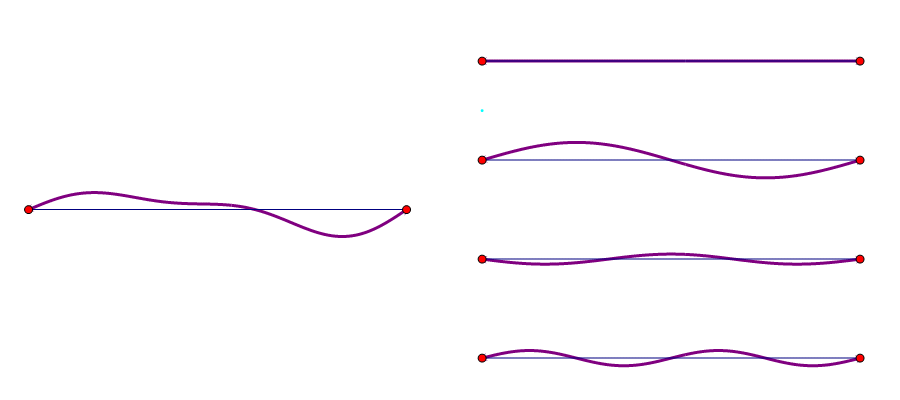 大家都見過琴絃,比如吉他、二胡、小提琴、琵琶或者古琴的弦。琴絃為什麼能發出特定頻率的聲音?因為在兩端固定的情況下,它只能出現某些特定的振動模式,其中除了兩個端點之外還有一些點不動。這樣的點叫做節點,這樣的振動叫做駐波。隨着節點的數量從0到1到2到3,振動模式的波長就從弦的長度到它的1/2、1/3、1/4,頻率就從基頻到它的2倍、3倍、4倍,這些高頻的振動就是泛音。多個振動模式可以疊加起來,合成複雜的振動模式。不同樂器中這些泛音的比例不同,就形成了不同的音色。
