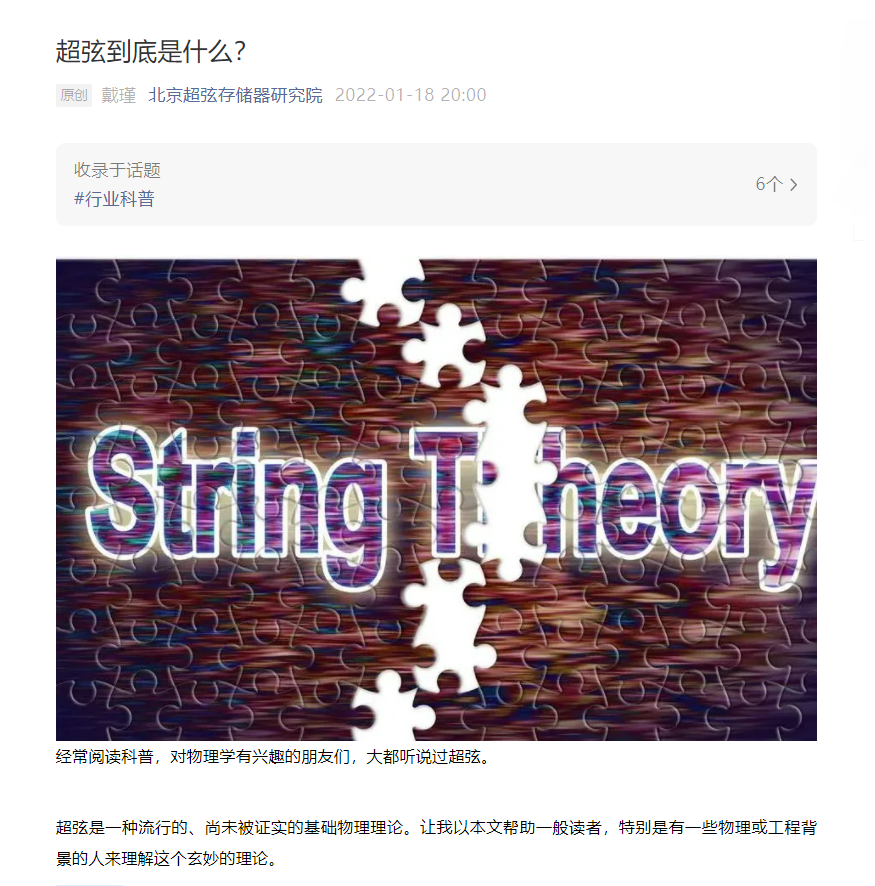 研究院的創始人年輕時聽説過超弦,覺得這個詞很酷,就用了這個名字。全院上下只有戴瑾一個人知道超弦是怎麼回事,於是他就寫了這篇科普,幫同事們瞭解一下。搞半導體工藝的工程師們基本都學過一些量子力學,大致可以看懂,於是就到處傳開了。