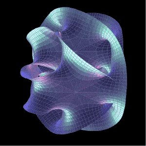 有趣的是,研究發現那個6維小空間的超對稱性偏好特殊的一類,叫做卡拉比-丘空間。這個丘就是丘成桐,第一位獲得菲爾茲獎的華人數學家。下圖是一個卡拉比-丘空間的例子。由於視覺無法呈現6維空間,它其實是6維空間在二維的一個截面,可以讓我們感受一下它的複雜程度。
