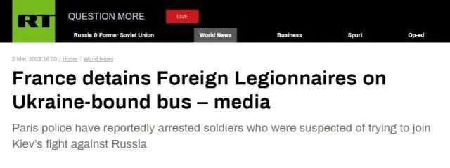 3月1日,法國警方攔下了一輛開往烏克蘭的巴士,發現30名乘客中有14名法國**“外籍軍團”**士兵,他們都是烏克蘭公民,向部隊請假後,想回國參戰的。
