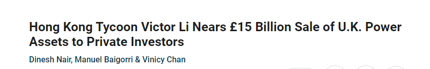 彭博社4日報道,李家已將旗下英國配電公司UK Power Networks擺上貨架,估值150億英鎊,約合1260億元人民幣。對比2010年買入時的58億英鎊,現在售價達到近3倍。