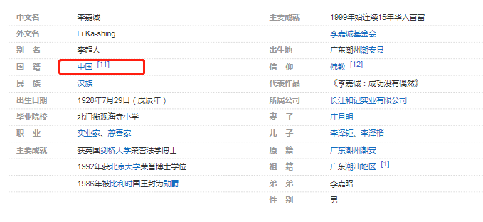作為證據,有人翻出百度百科有關李嘉誠的詞條,國籍一欄顯示的是“中國”。