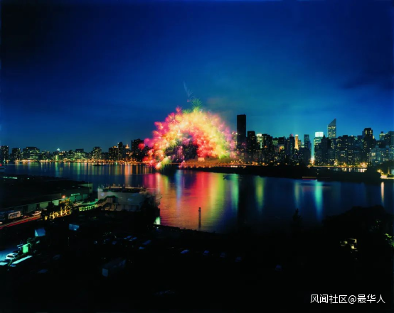 在紐約東河海濱,他用焰火搭出一架色彩斑斕的《移動彩虹》,為黑夜編織夢幻。