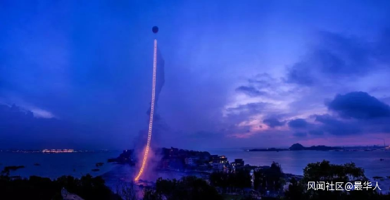 2015年6月,蔡國強回到老家福建泉州的惠嶼島上,在籌備了半個月後,終於將通向天空的天梯點燃。