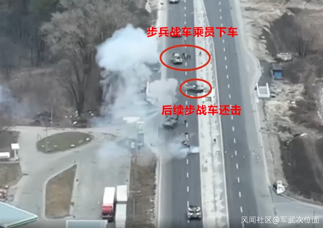 發現前車被襲擊後,車隊後方的BMP步兵戰車、坦克等同時動作,第二輛步兵戰車和被擊中的T-72坦克協同行動,掩護坦克脱離交戰區;隨後的兩輛步兵戰車立即轉向主要威脅方向,剛剛轉到位即打開尾門放步兵下車。交戰開始後不到10秒,BMP-2步戰車的2A42型機關炮已經在對烏軍藏匿的方向開火了;同時,下車步兵也迅速展開戰鬥隊形,有些在地面卧倒,有些迅速跑向公路另一側並散開,依託路基尋找掩護。
