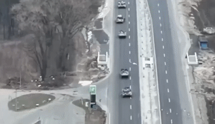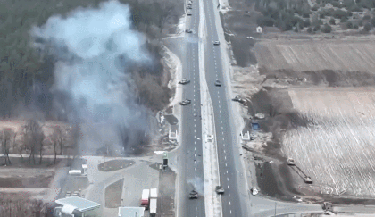 據稱,這段視頻的拍攝地點,在布羅瓦利北郊的斯基賓,就在城區的入口處,北邊有一個小型加油站,加油站靠西南方有一片樹林,非常適合人員隱蔽。俄軍以T-72坦克為前導,後方有數輛BMP-2型步兵戰車,再然後是2輛T-72坦克,緊隨其後的則是卡車車隊,沿着E95公路一路南下,進入布羅瓦利區。沒想到,公路右側的樹林裏,突然打出了一枚反坦克火箭筒,從煙霧來看,有可能就是NLAW輕型反坦克導彈。