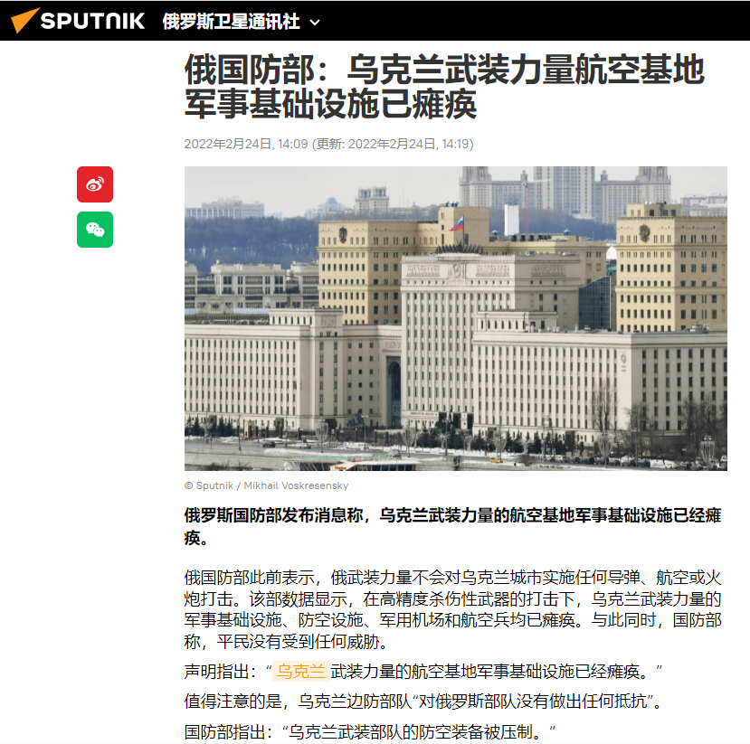 早在開戰第一天,俄軍就對烏克蘭境內展開了大規模的打擊,不到兩個小時,俄羅斯國防部就已經站了出來,宣佈烏克蘭國內的重要軍事目標已經被全部摧毀,烏克蘭海空軍已經成為歷史。