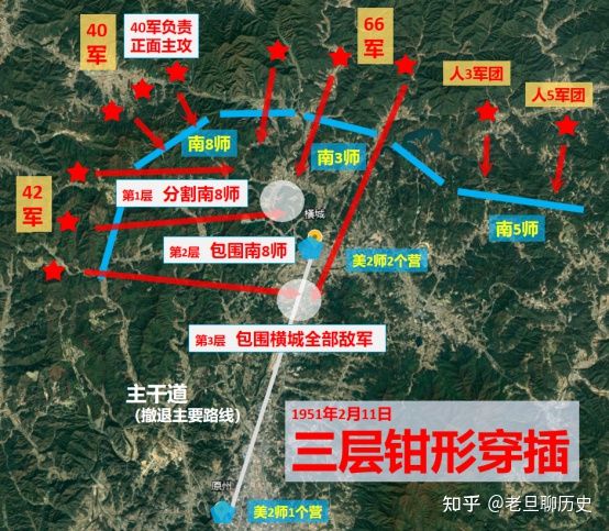 1、第一層:42軍124師和66軍198師,預定廣田地區匯合,對南8師形成分割。2、第二層:39軍117師(此時配屬42軍)和66軍197師,目標是橫城北的鶴谷裏和夏日,對南8師形成徹底包圍;3、第三層:42軍125師和66軍196師,直接插向橫城以南通往原州的29號公路,目的是包圍整個橫城的全部部隊;4、最後,由40軍負責正面壓上,把敵人往口袋裏趕羊。