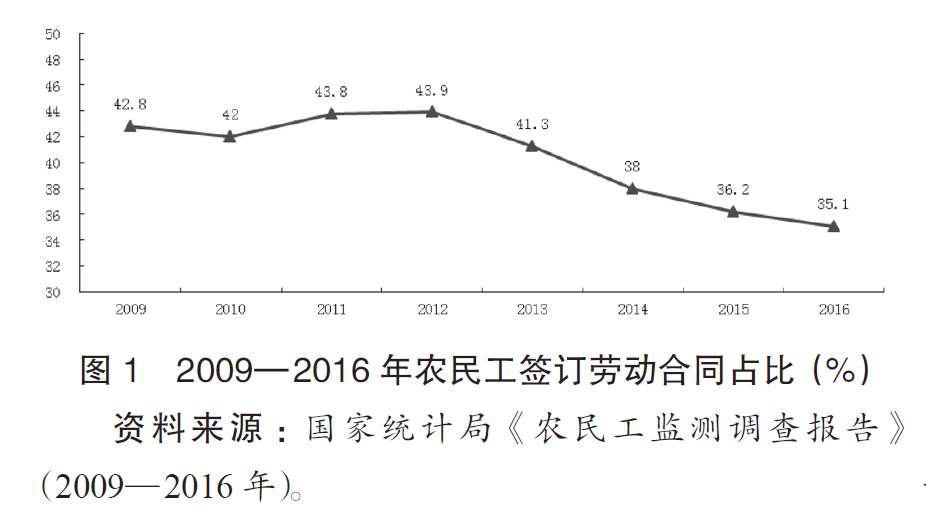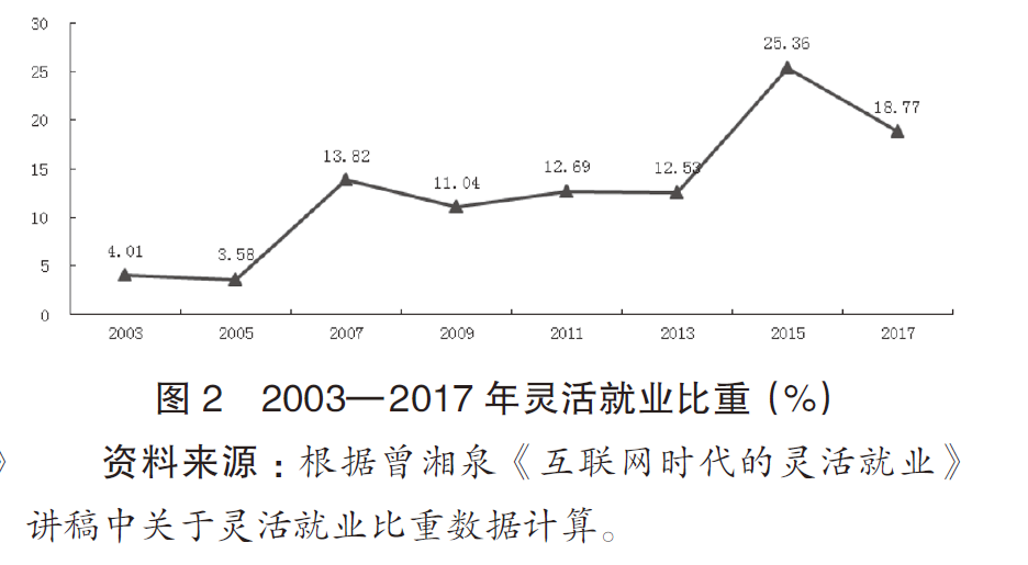 憑藉具有吸引力的用工模式,越來越多的勞動力開始選擇在零工經濟中長期工作,而零工經濟也早已經不是當年在街頭巷尾擺攤、“開黑車”、做家政這樣零散、臨時性、沒有規範的工作狀態,而是藉助互聯網實現了高度組織化、高度平台化、高度技術化、高度資本化。在零工經濟的推動下,靈活就業開始具有結構明晰的中心結構和領導結構,幾個大平台下有幾百萬、上千萬的靈活就業人員,並日益呈現集中化的態勢。在這樣的背景下,當前我國勞動力市場呈現出正規就業不斷減少、靈活就業不斷增多的態勢。從歷次農民工監測報告可以看到,2008—2018年,從事製造業的農民工佔農民工總量的平均年增長率為-2.84%,呈現明顯的下降趨勢。農民工簽訂勞動合同的佔比,從2009年的42.8%一路下滑到2016年的35.1%(見圖1)。勞動合同簽訂率是反映正規就業最重要的衡量指標,通過簽訂勞動合同,才能建立勞動關係,保障勞動待遇,實現穩定長期就業。與此同時,靈活就業的比重也在不斷上升,把自由職業、自主創業、靈活就業等類別數據歸納在一起,2003年的佔比只有4%,而2017年已經快速增長到18.7%(見圖2)。現在很多學者測算,我國當下的靈活就業比重應該已經超過20%。隨着更多的勞動力流向零工經濟,製造業將持續面臨招工難以及勞動者年齡老化的問題。農民工監測調查報告顯示,50歲以上農民工在農民工整體佔比中快速提升,2008年50歲以上農民工佔比為11.4%,2017年首度超過20%,2019年達到24.6%。