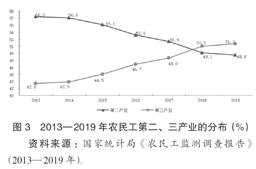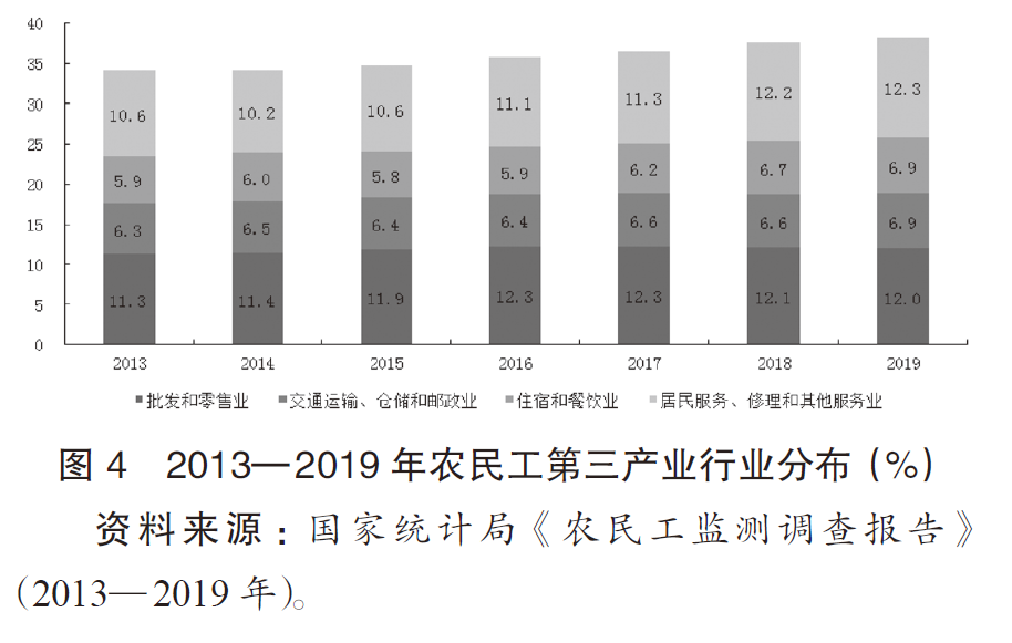 反觀中國,服務業佔GDP的比重從1980年的22.31%,增長到2018年52.16%;而工業增加值佔GDP的比重從1980年的48.06%,下降到2018年的40.65%。尤其近年隨着平台經濟的快速發展,由於不需要支付傳統勞動關係中需要承擔的大額勞動保障成本,憑藉自由靈活的就業方式以及高市場工資溢價的優勢,許多農民工羣體紛紛從第二產業轉向第三產業,從線下走到線上。農民工從事第二產業的比例,從2013年56.8%下降到2019年的48.6%;而從事第三產業的比例,從2013年42.6%增長到2019年的51%,並形成了“剪刀差”效應(見圖3)。這其中,從事交通、運輸、倉儲郵政業的農民工快速增長,比重從2013年的6.3%增長到2019年的6.9%(見圖4)。加之勞動力市場供給總量不斷減少,更加劇了製造業類的實體經濟招工難的問題,最終使得我國沿海製造業出現跨國遷移的現象,我國也開始面臨產業空心化的挑戰。