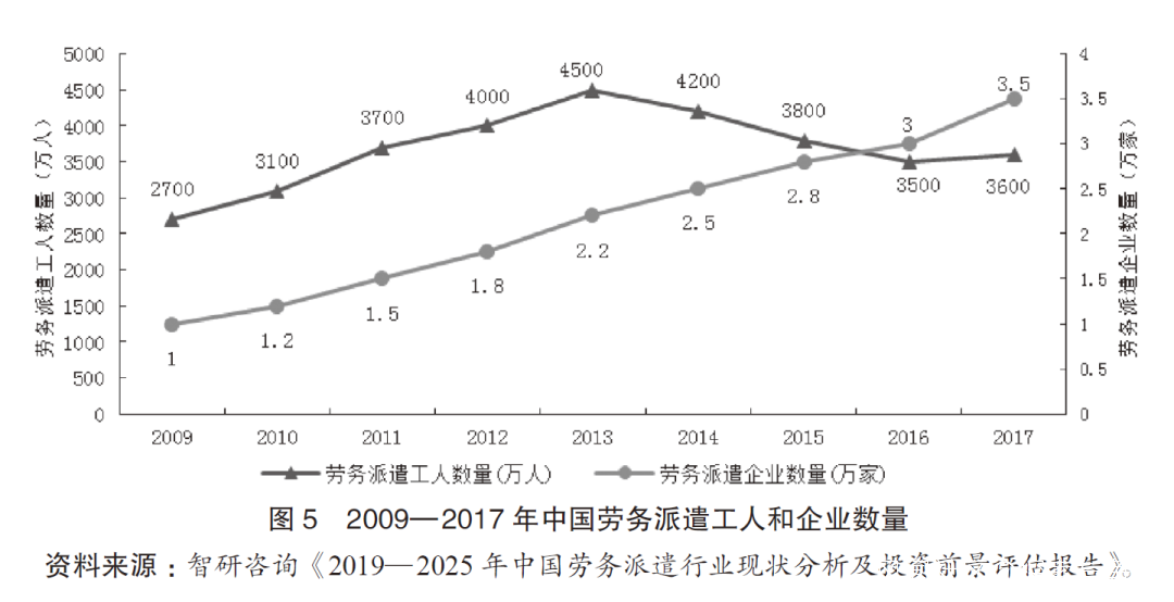 其次,在社會層面可能形成勞動者權益“逐底競爭”的局面。為了應對零工經濟的政策溢價優勢,製造業也儘可能在勞動力成本上進行削減,採取更靈活的用工方式。其中,勞務派遣已經成為企業靈活用工的重要渠道,並在全世界不斷發展壯大。我國2012年《勞動合同法》的修訂,專門針對勞務派遣濫用問題進行了規制。但實際上,勞務派遣依然處於飛速發展的階段,只不過進化為更高級的形態。相關數據也顯示,勞務派遣工的數量在2012年《勞動合同法》修改以後有所減少,但是勞務派遣的企業數量卻一直在飛增(見圖5)。一方面,大量企業把公司內的部分業務或職能工作內容發包給勞動派遣機構,以業務外包的方式取代傳統勞務派遣,以規避《勞動合同法》的規制。另一方面,勞務派遣與零工經濟相互融合,並不斷衍生出新的靈活化用工方式。不少平台公司把勞務派遣人員註冊成為個體工商户,通過轉變勞動者身份的方式來與企業形成商事合作關係,並憑藉國家對個體工商户和小微企業免税的相關政策,把工資關係轉變為企業間的經營業務關係。勞務派遣憑藉靈活性的特徵,日益受到企業青睞,並形成“不求所有,但求所用”的流行用工觀念。在沿海地區,勞務派遣中介公司甚至成為勞動力配置的主要渠道。企業和勞動者在勞動力市場相互搜尋已經不是面對面,而是陷入“通道壟斷”的狀態,鏈條上游的企業和鏈條下游的求職者之間隔着大量勞務公司、黃牛、勞務中介三層組織,通過複雜的“返費”制度才能串聯起來。