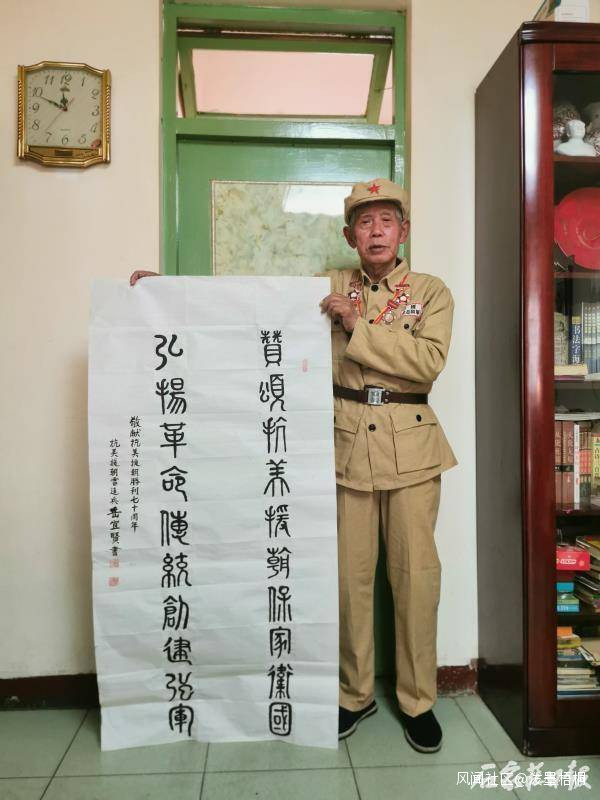 “我永遠忘不了那些犧牲的戰友們。教育孩子們珍惜來之不易的幸福生活,繼承革命戰士的優良傳統,也是我一名抗美援朝老兵的責任。大家應該不忘過去、珍惜今天、創造更加美好的明天。”穿上志願軍的軍裝,戴上多枚紀念章,嶽宜賢精神抖擻。他猛地敬了一個軍禮,同時拿出了自己精心書寫的書法作品向中國人民志願軍抗美援朝出國作戰70週年獻禮。