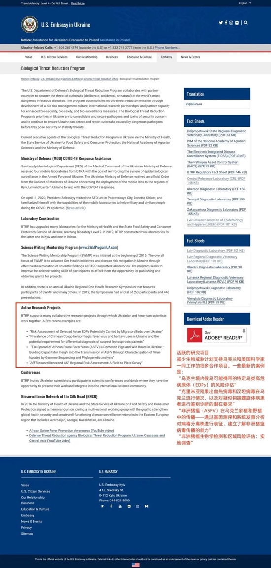 截至目前,任何人都可以通過網絡緩存訪問美國駐烏克蘭使館網站上的生物實驗室相關信息。它們被命名為“減少生物威脅計劃”,並明確包括剛果出血熱、漢坦等高致死病毒相關內容。