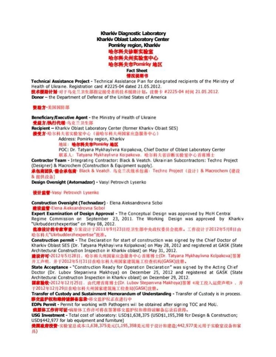 這是通過網絡緩存從美國駐烏克蘭大使館網站獲取的、位於哈爾科夫的實驗室相關文件,這座實驗室由美國國防部資助近164萬美元建立。儘管這些生物實驗室在烏克蘭方面的合作者中包括食品、衞生、科技和國防等多類機構,但美方合作者主要是美國國防部。