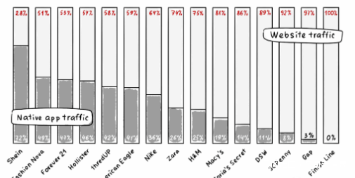 將歐美消費者引向SHEIN的App而不是網站,從而將戰場轉向中國人最擅長的地方:移動電商。這一點在數據上就足以顯現:SHEIN的App流量佔比遠超其美國競爭對手們。