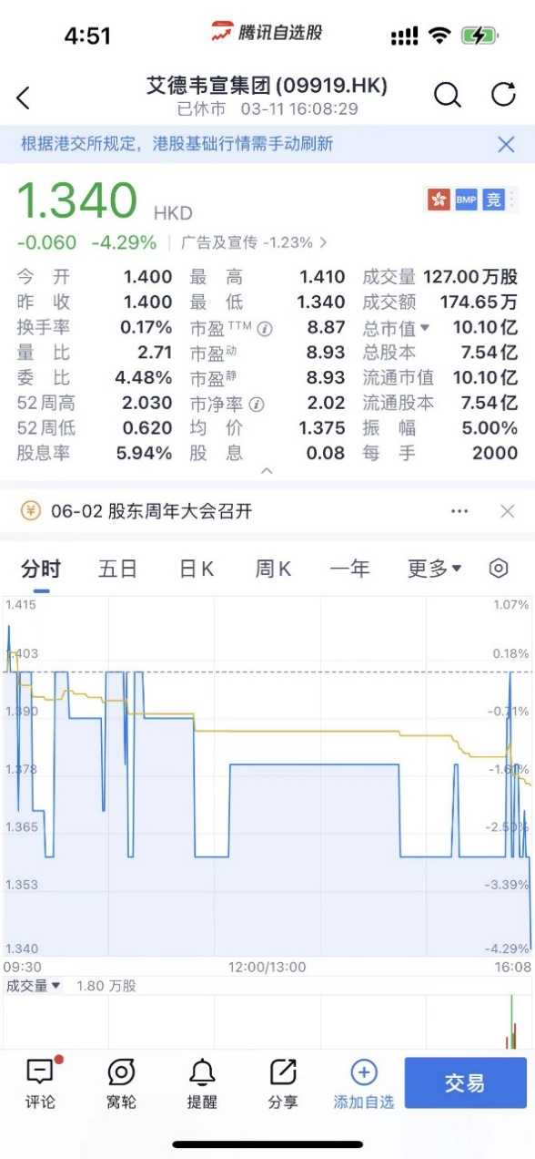 我們先來看下艾德韋宣公司的股票情況,按照2022年2月11日的情況來看,一天的成交額是174.65萬,這麼“大”的交易額就導致日交易先就跟快斷氣的人的心電圖差不多。如果按照其所公佈的約人民幣102.6百萬元的年淨利潤來説,這一年賺的錢都不足以覆蓋一天的回購。