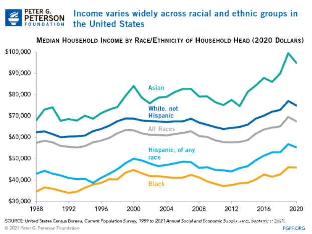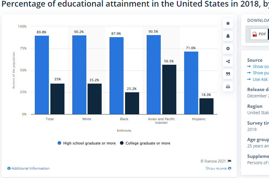 截至2018年,亞裔羣體在平均收入、大學受教育率兩項數據上都大幅度領先包括白人在內的其他族裔(圖五、六),這個因素當然有美國開放移民後大量掐尖世界各處精英亞裔入籍的影響,但是考慮到亞裔在美人口總人數從1970年代的百萬之數到2020年的接近兩千萬,近二十倍增長幅度的情況下收入水平與教育率還能保持逆勢增長的勢頭,這一結果固然與美國移民政策的篩選有關,但也與亞裔社區互相提攜,互相幫助的傳統分不開關係。