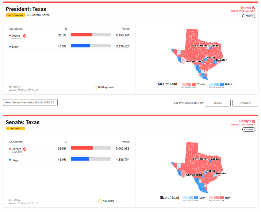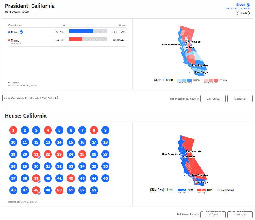 以最典型的紅藍州加利福利亞與德克薩斯為例:2020年總統大選中,深藍色的加利福利亞有六百萬人(34.3%)投給了川普,深紅色的得克薩斯有五百萬人(46.5%)投給了拜登。