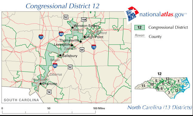 同時,美國地方選區的劃分非常有門道:參考下圖中北卡萊羅納州國會第12選區,這個複雜到堪稱畸形的選區劃分,是民主黨精心規劃設計,確保選區內黑人鐵票佔絕對多數的結果,而這種造型的選區在美國各地比比皆是——民主黨和共和黨都需要通過這種手段來保證競選時本黨能夠佔優。