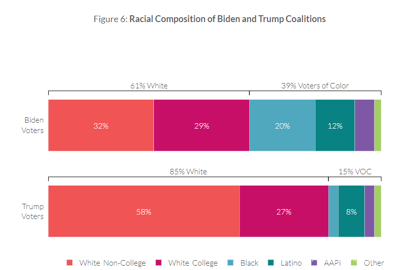 以投票參與率近幾十年內最高的2020年大選數據為準,在美國1.68億登記選民裏,美國各州平均有66.7%的人蔘與投票,其中白人參與率最高為71%(正常為~65%左右),黑人其次58%,亞裔60%,西班牙裔54%。最後的結果可見下圖: