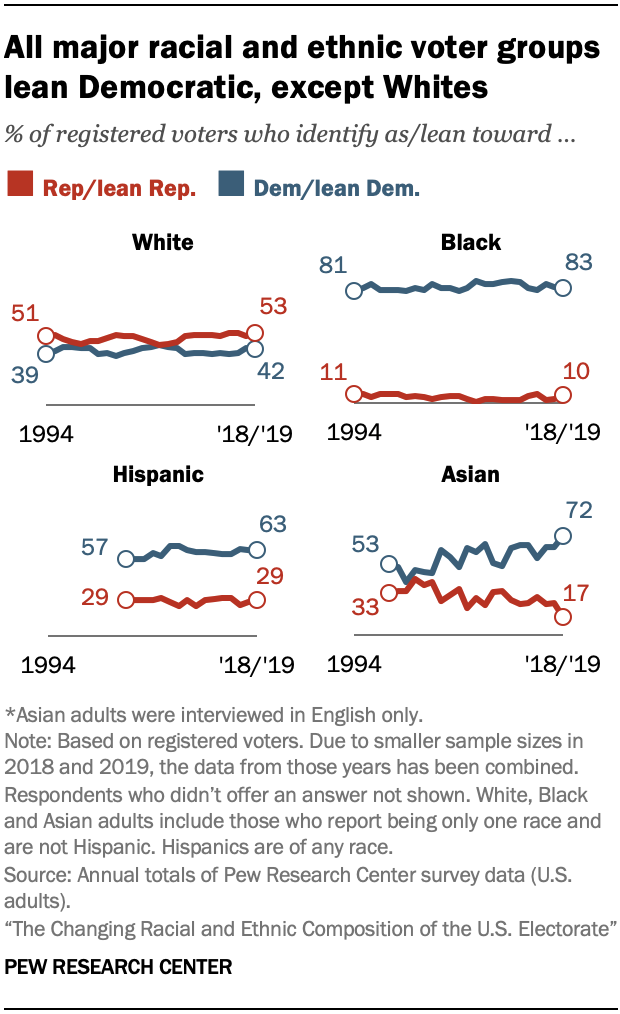 根據皮尤研究中心的統計數據我們可知,在近三十年裏,白人羣體對於民主黨/共和黨的選票基本上穩定在為五成共和黨,四成民主黨的比例上,這一點在搖擺州最為典型,因為藍州會更加傾向民主黨,紅州會更加傾向共和黨。