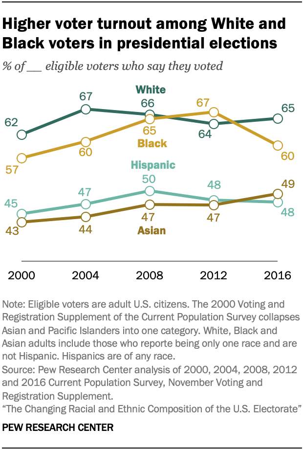他的判斷一點都沒錯:自民權法案之後,廣大黑人羣體確實成為了民主黨的大票倉。在他之後舉行的每次一大選中,80%以上的黑人選票投給了民主黨,剩下的20%裏也只有10%左右投給了共和黨。更關鍵的是,在總統大選這種重要時刻,黑人社羣出來投票的比例也顯著高於其他少數族裔,不遜於白人羣體。